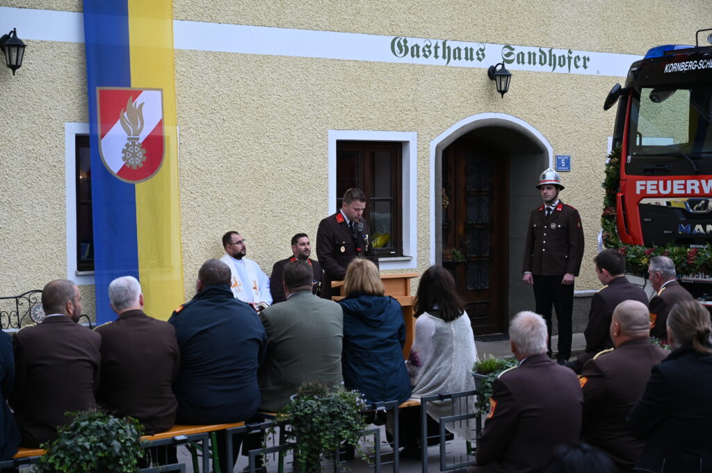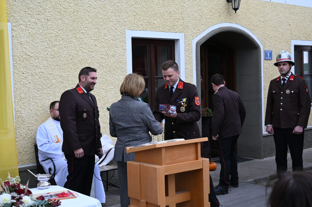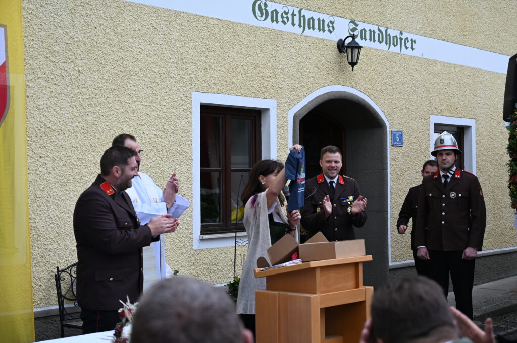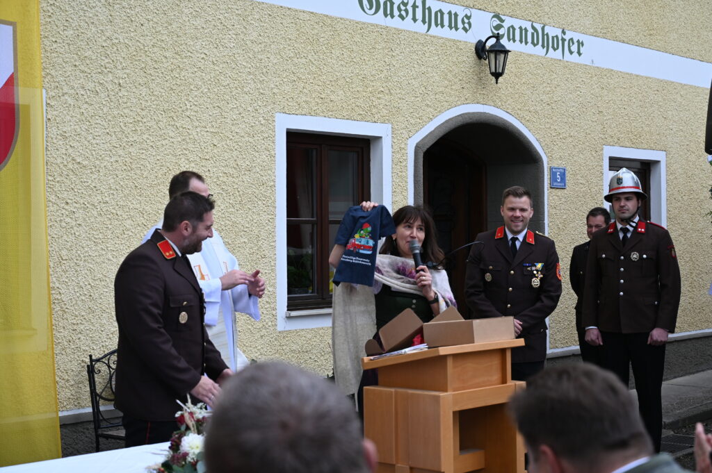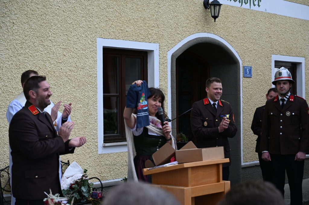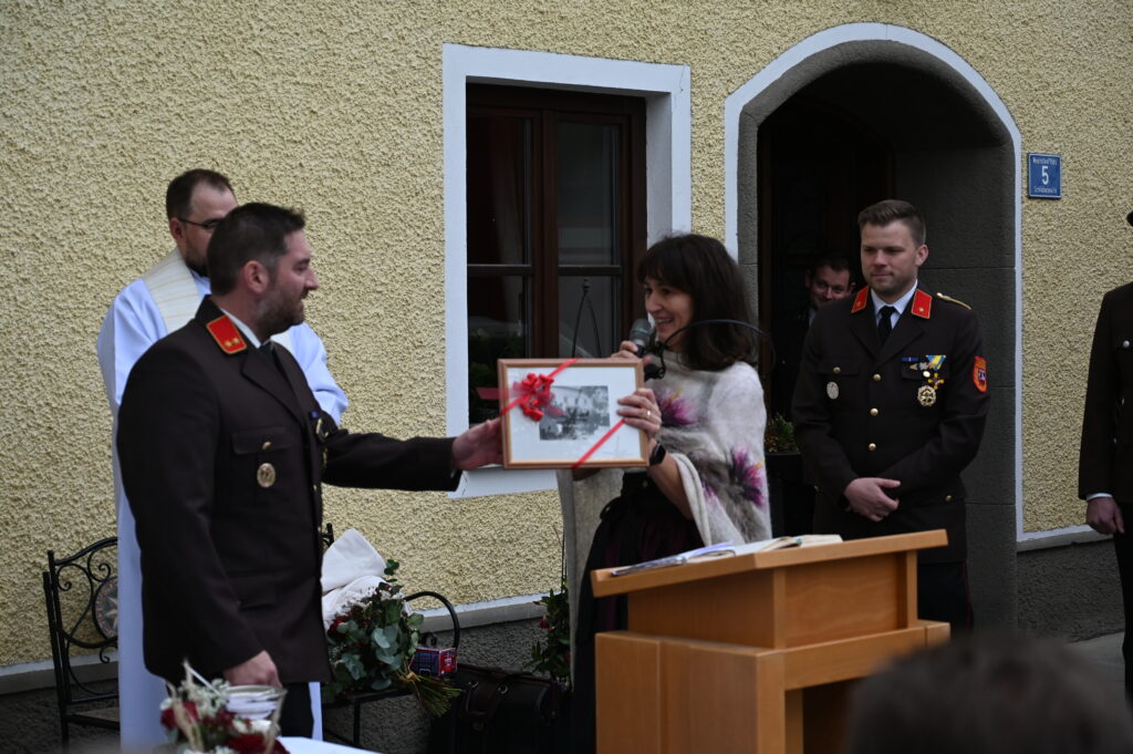 Ein besonderer Moment war die Vorstellung der Fahrzeugpatin Christiane Scheiblauer, die ihre Aufgabe sichtlich gerührt übernahm. Als Patengeschenk überreichte sie der Feuerwehr T-Shirts für die jüngsten Mitglieder sowie ein historisches Foto, das ein Mannschaftsbild zeigt, das vor rund hundert Jahren direkt vor ihrem Haus aufgenommen wurde. Damit brachte sie ihre enge Verbundenheit mit der Feuerwehr Kornberg-Schlickenreith auf besonders persönliche Weise zum Ausdruck.