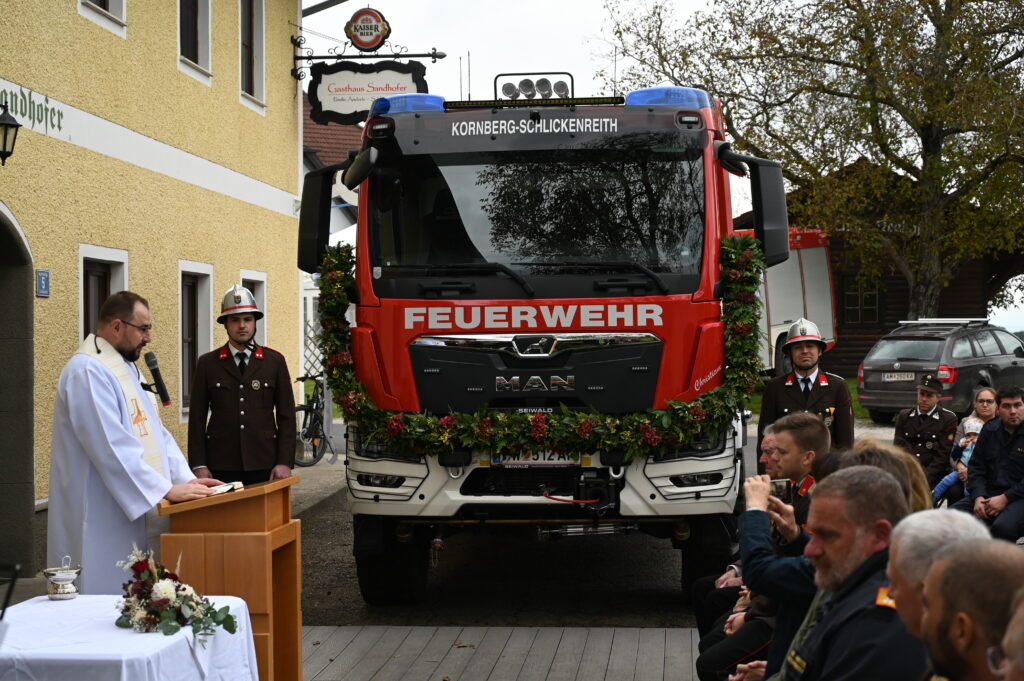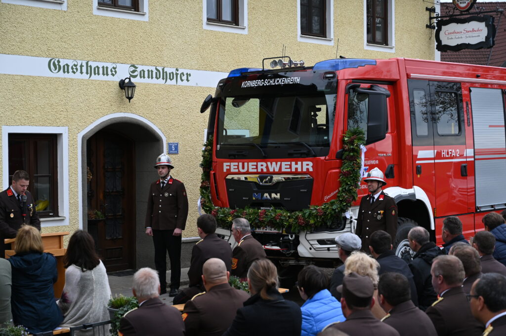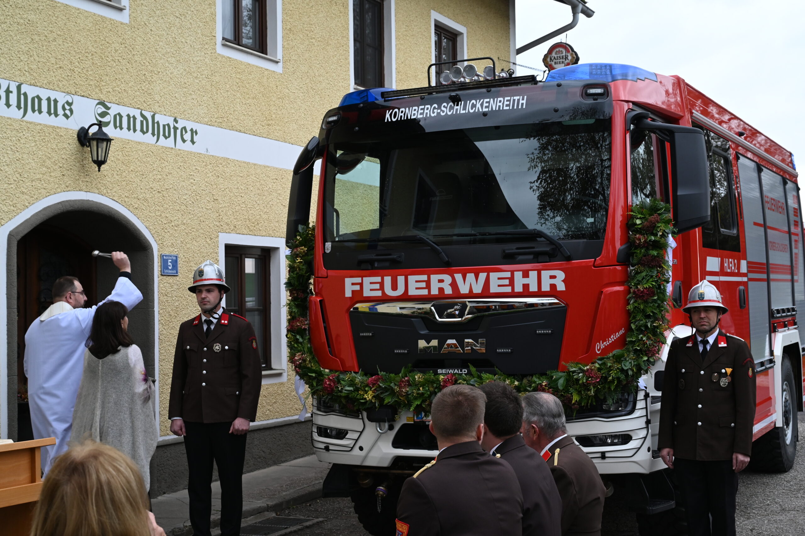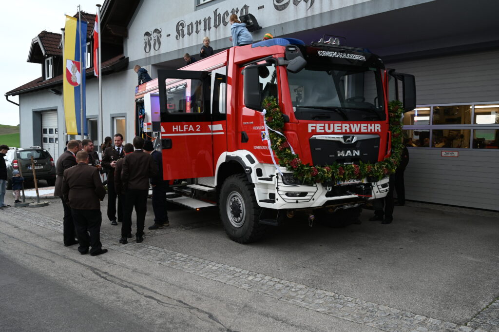 Bei strahlendem Herbstwetter am 11.Oktober, fand die feierliche Segnung des neuen HLFA 2 der Freiwilligen Feuerwehr Kornberg-Schlickenreith statt. Kommandant Stefan Anderle begrüßte zahlreiche Ehrengäste, Vertreter der umliegenden Feuerwehren sowie viele interessierte Besucherinnen und Besucher, die der Einladung zur Fahrzeugsegnung gefolgt waren.