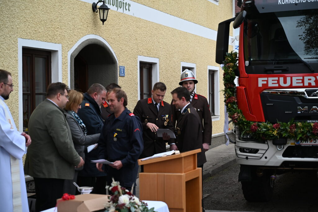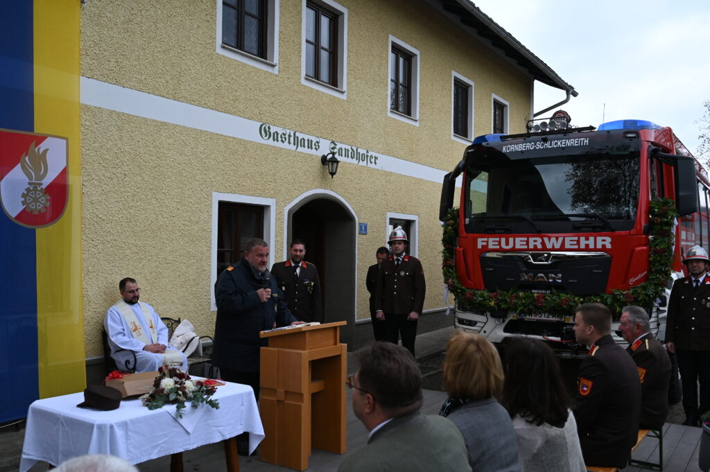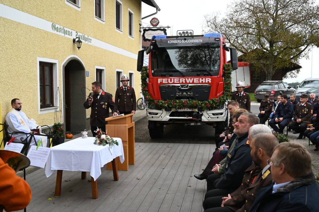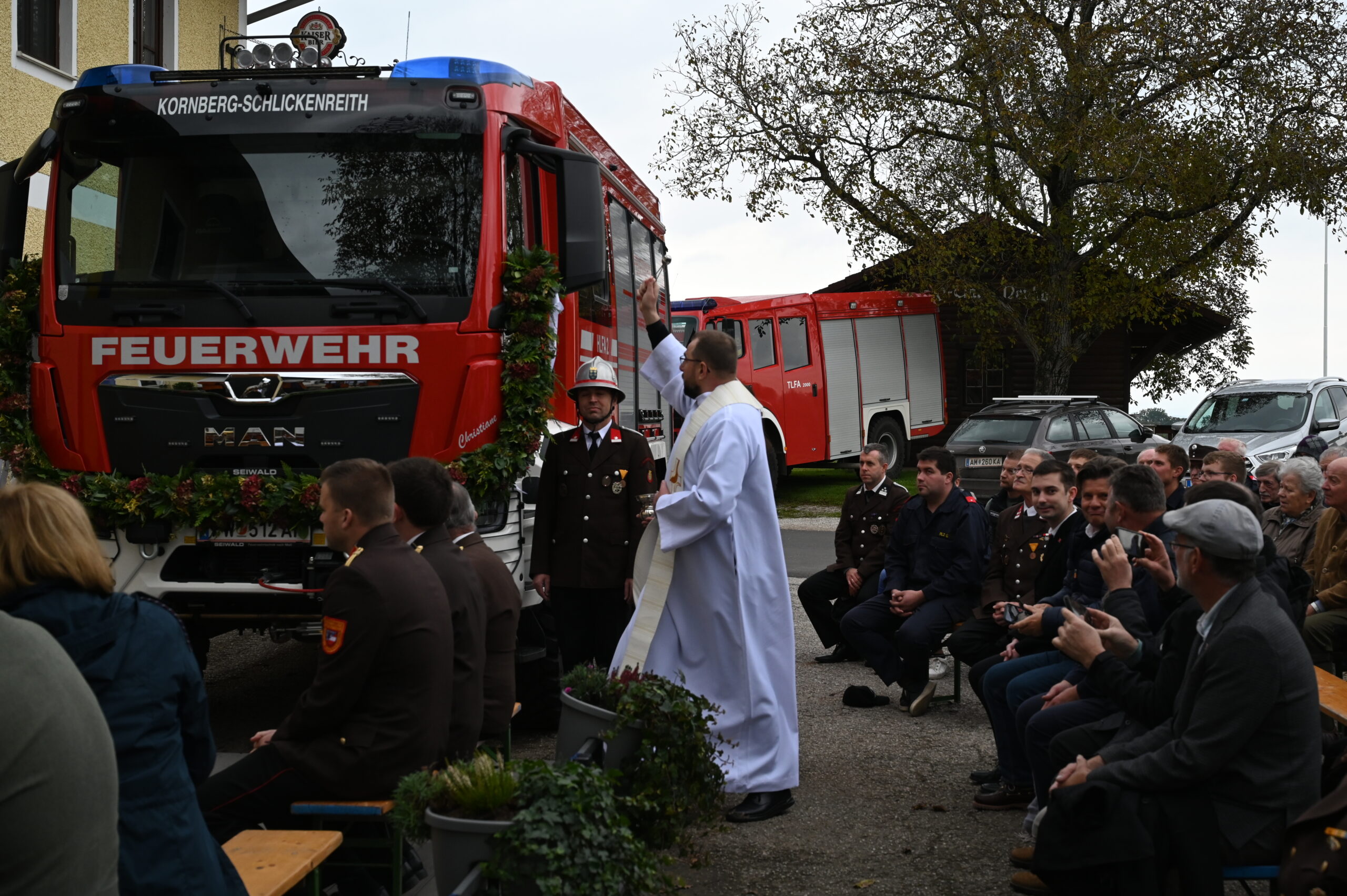 Bei strahlendem Herbstwetter am 11.Oktober, fand die feierliche Segnung des neuen HLFA 2 der Freiwilligen Feuerwehr Kornberg-Schlickenreith statt. Kommandant Stefan Anderle begrüßte zahlreiche Ehrengäste, Vertreter der umliegenden Feuerwehren sowie viele interessierte Besucherinnen und Besucher, die der Einladung zur Fahrzeugsegnung gefolgt waren.